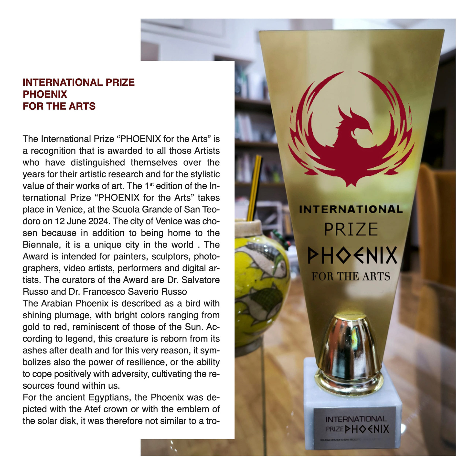 国際芸術賞「Phoenix for the Arts」を Fondazione Effetto Arte より授与されたことを、心から光栄に思います。この名誉ある賞は、芸術界への顕著な貢献をしたアーティストに贈られます。授賞式は 2024年6月12日にヴェネツィアの Scuola Grande di San Teodoro にて行われました。